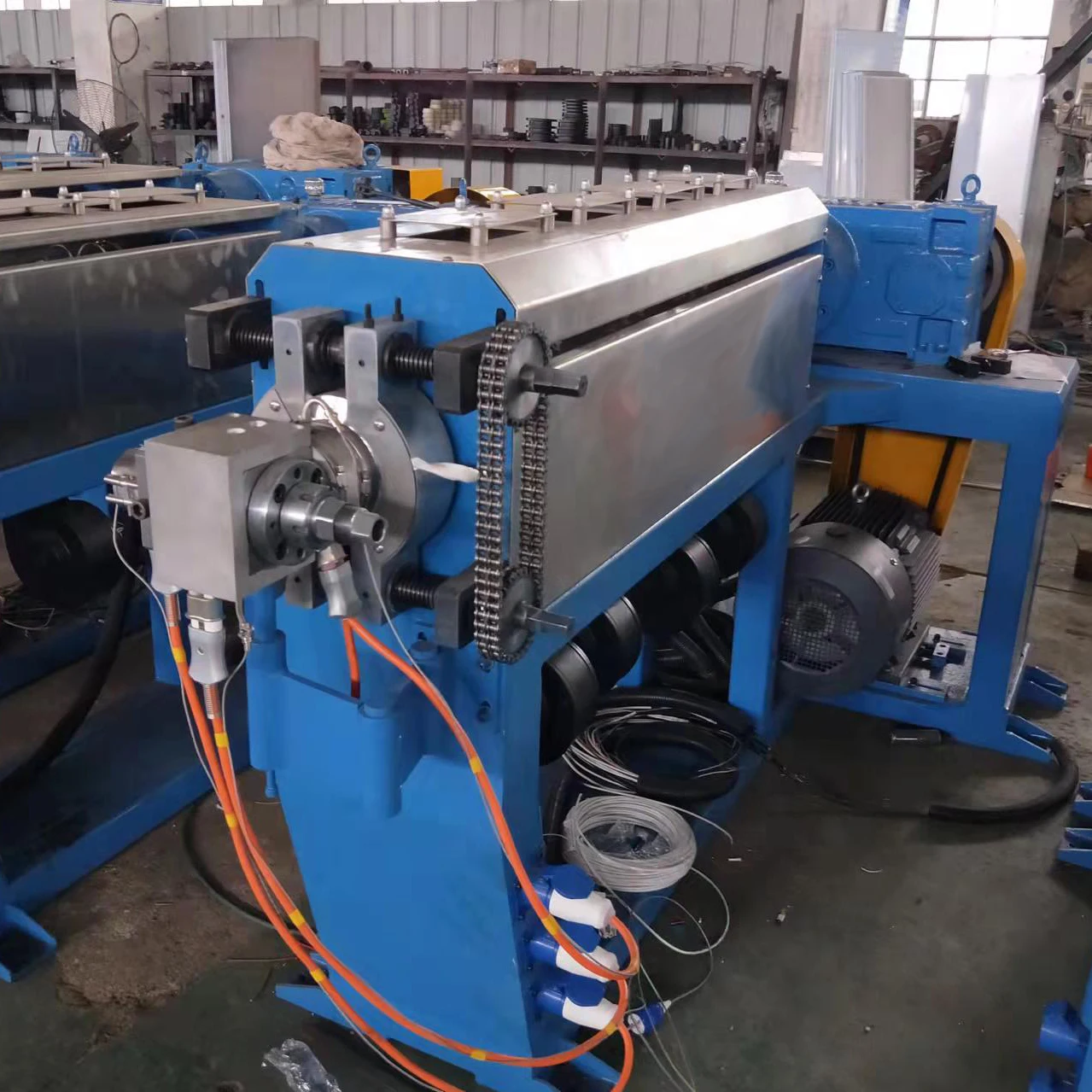 This unit is mainly suitable for encapsulating wires and cables with thermoplastic cable materials such as PVC/PE/XLPE/low smoke halogen-free through hot extrusion method. This unit has the advantages of high temperature control accuracy, excellent output stability performance, energy-saving stability, and high degree of automation.